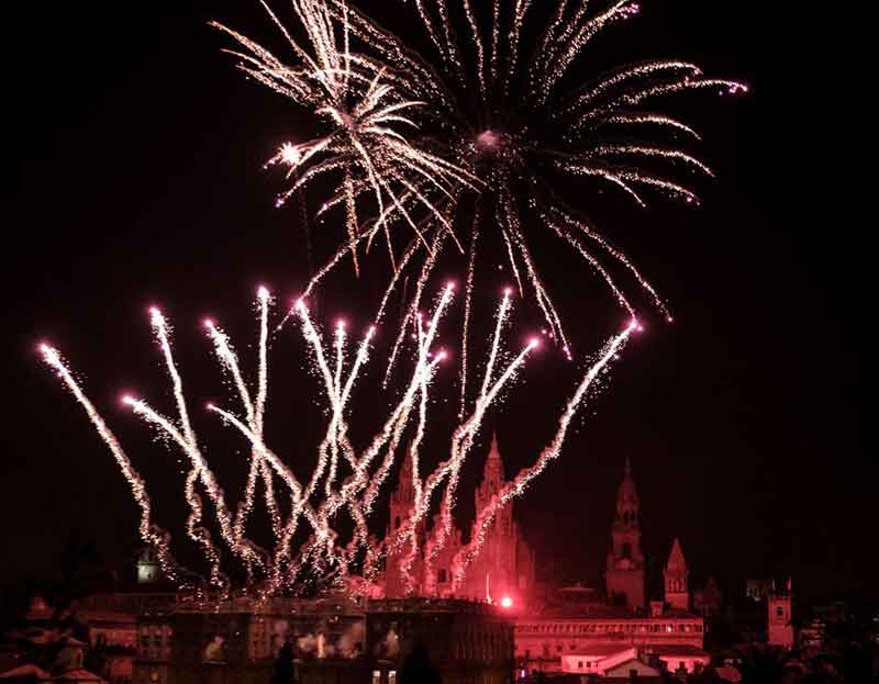 Fuegos del Obradoiro: la noche del 24 de julio, la fachada de la Catedral se convierte en un espectáculo de luces y fuegos artificiales que atrae a miles de personas.